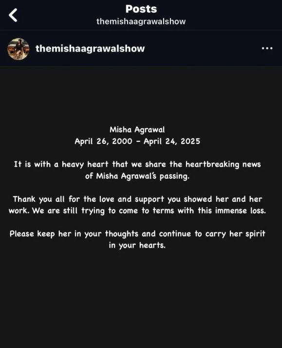 “It is with a heavy heart that we share the heartbreaking news of Misha Agrawal’s passing. Thank you all for the love and support you showed her and her work. We are still trying to come to terms with this immense loss,” the statement posted on the official Misha Agrawal Instagram account.